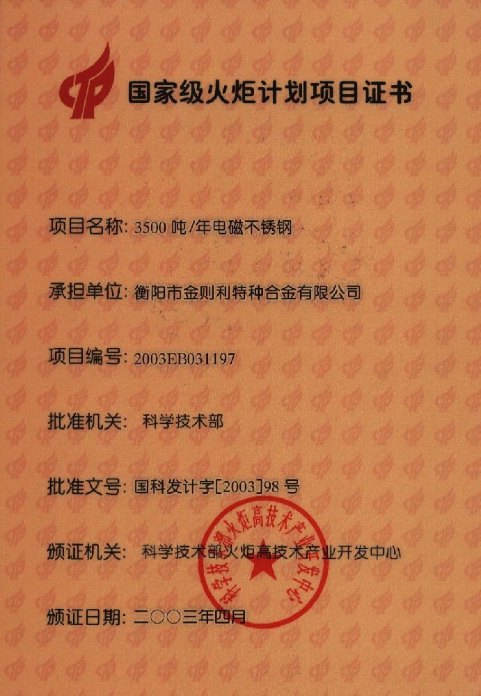 • 國家級(jí)火炬計(jì)劃項(xiàng)目證書